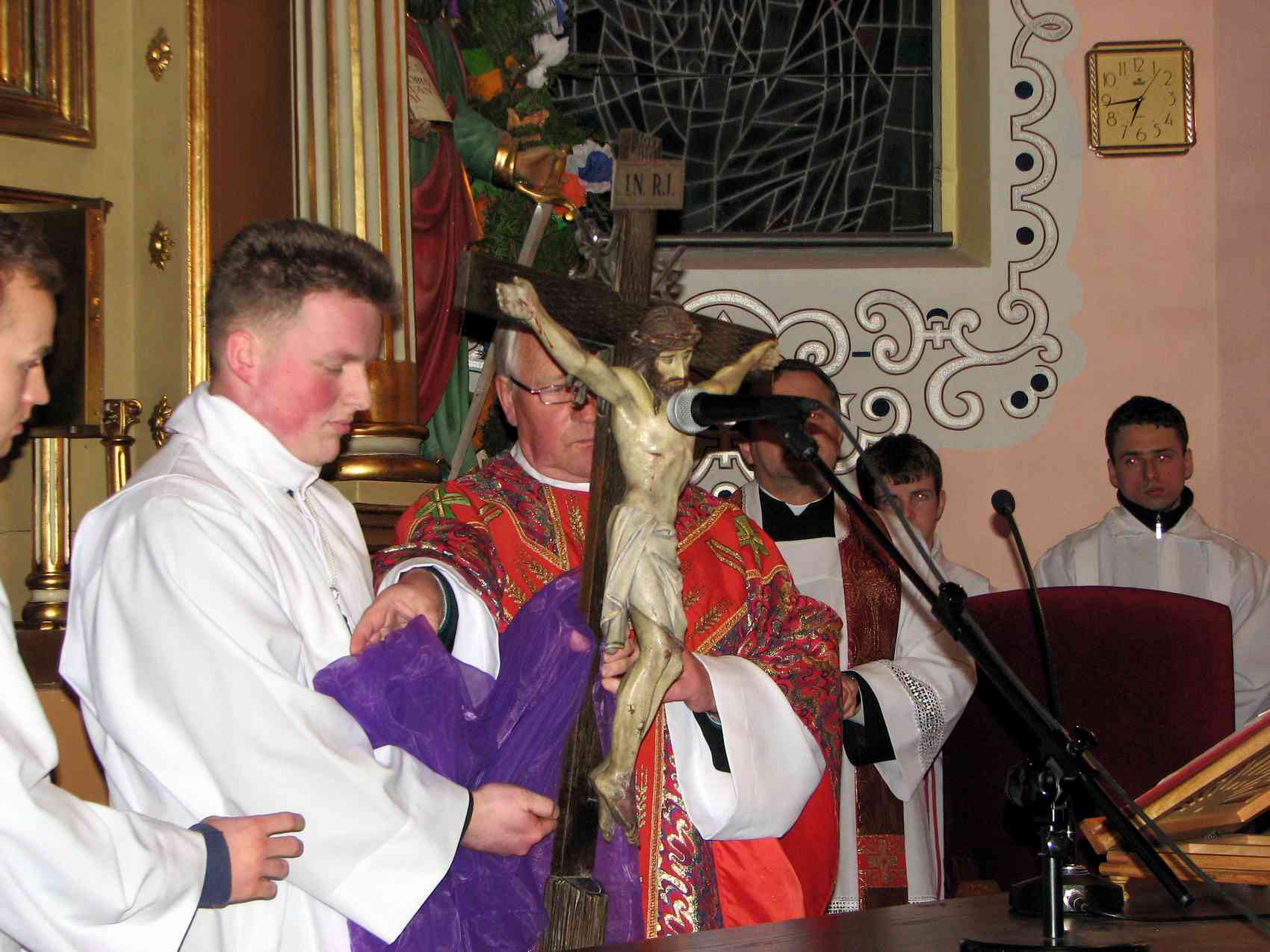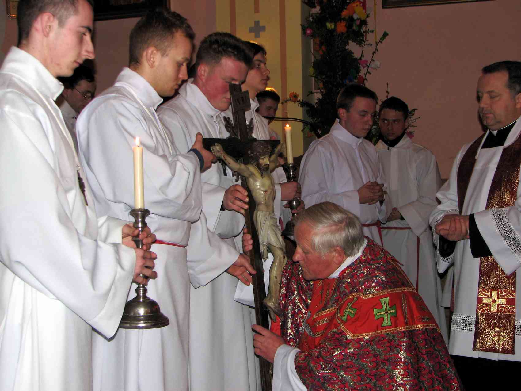 Podczas liturgii Wielkiego Piątku słuchaliśmy śpiewanej pasji z ewangelii św. Jana oraz modlitwy w intencjach kościoła i świata. Adorowaliśmy święty krzyż Chrystusa Pana oraz przyjęliśmy komunię św. Był to jedyny dzień w roku kiedy Kościół nie sprawuje mszy św. Po liturgii Najświętszy Sakrament został przeniesiony do grobu. W godzinach nocnych odbyły się adoracje stanowe młodzieży, matek oraz ojców.