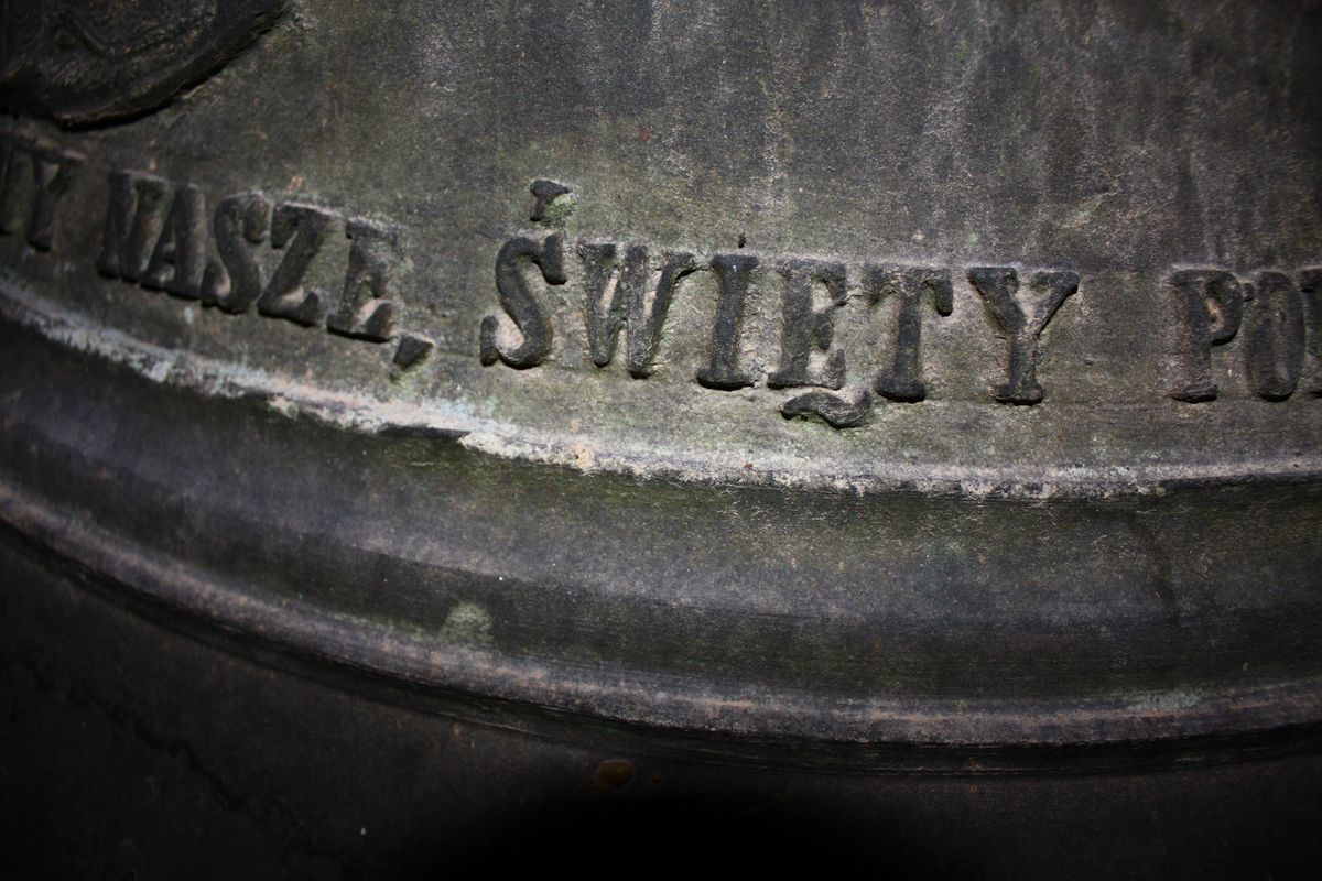 Zużyty dzwon Matki Bożej Pocieszenia z wyraźnymi pęknięciami zagrażającymi dalszemu użytkowaniu.